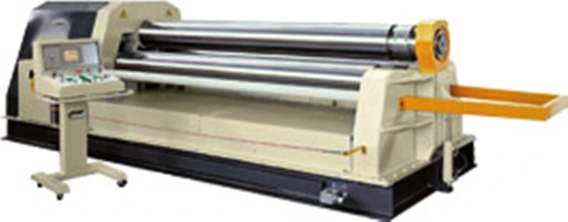 Our 4RH.PBS.NC 17/5, is a 4 roll, double pinch, fully hydraulic, NC Controlled plate roll which will pre-bend 10' x 5/8" and roll up to 3/4" plate. Machine has independent hydraulic adjustment and inclination of both lateral and pinch rolls; hydraulic powered rotation of the top roll and pinch roll using direct coupled high efficiency hydraulic motors and planetary reduction units.
