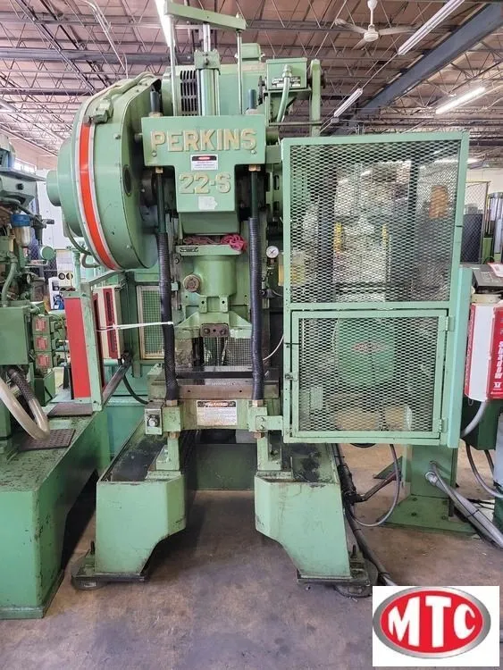 22 Ton Perkins 22-S Gap Frame Press W/ roll feed, Variable speed, Drive, Vamco CG6-6 Roll feed, Light curtains, Wintriss load analyzer, Air counter balance, air clutch, air brake, Work area guarding, Dual "inch" & "stroke" buttons, control panel and auto lube
